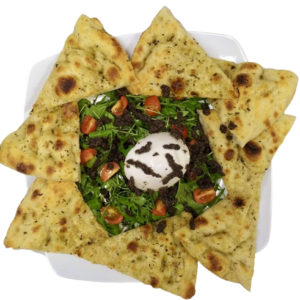 Burrata fresca sobre rúcula, tomates cherry, aderezo de trufa y toque de vinagre balsámico. Acompañado de focaccia.