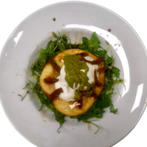Burrata fresca sobre rúcula, Torta de Inés Rosales, aderezo de pesto, tomates secos y toque de vinagre balsámico.